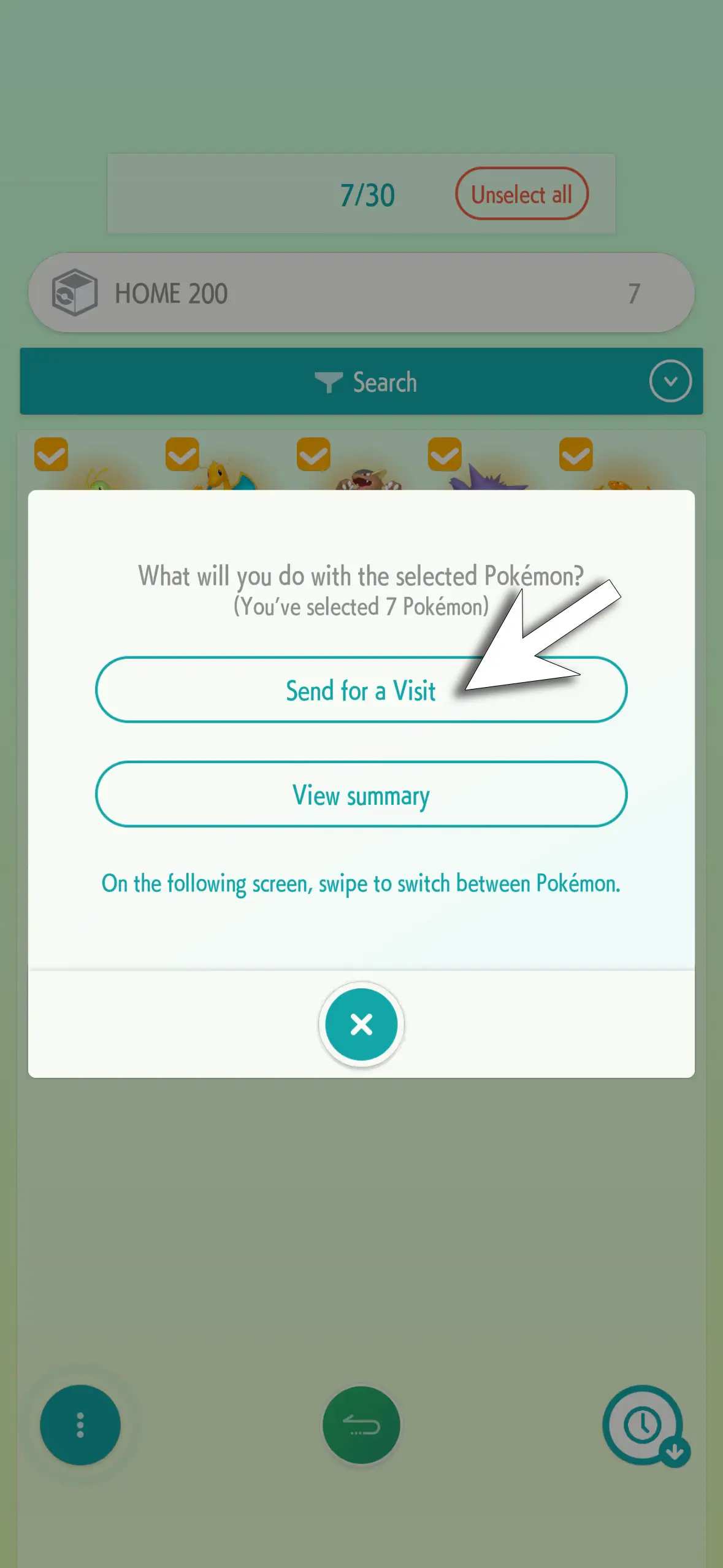 - Select the Pokémon you want to send for a visit, then tap the 'three dots' button in the lower left corner, then select 'Send for a Visit'
