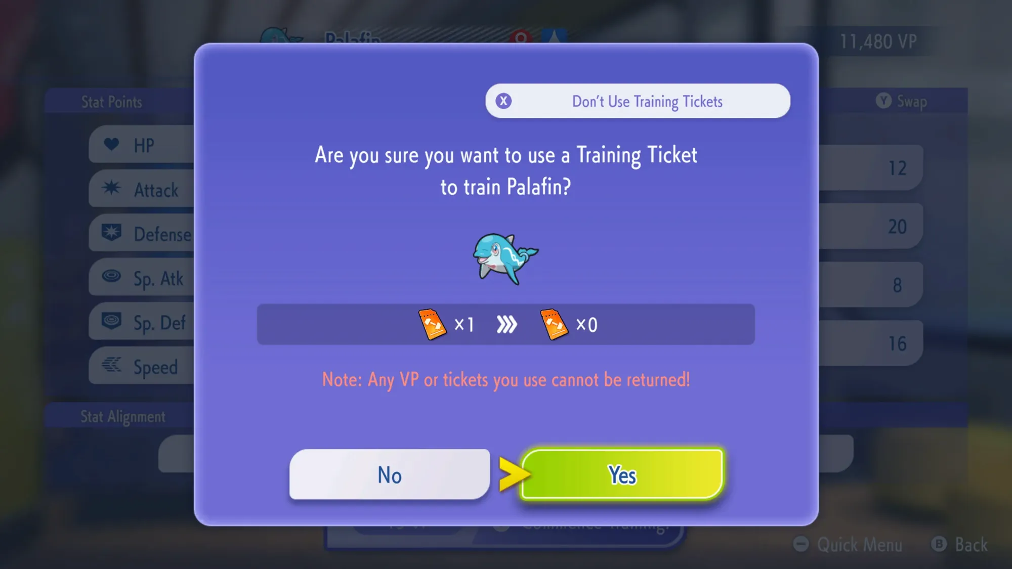 You are then provided with a confirmation screen. At this point, you can choose to spend a Training Ticket instead of VP by pressing the X button.